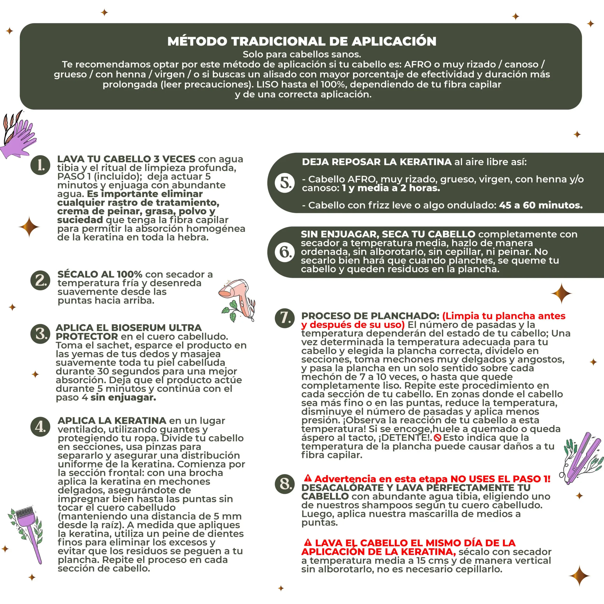 The formula is ammonia and formaldehyde free. It has natural efficient oils like argan oil, macadamia oil as well as other key ingredients such as aloe vera and green tea leaf extract that rejuvenates the hair, delivering nourishment and strength to the hair cuticle in order to repair damage, dryness, frizz and, unwanted waves and curls. Ideal for wavy, curly, 4a, 4b,4c and dry hair. Application tips for great results please read the instructions, test in a small amount of hair for allergies and consider having gloves, a coloring brush, a fine tooth comb, hair clips, hair dryer and a titanium plated hair iron. Enough for several applications depending on hair length, plus instructions in Spanish and English.